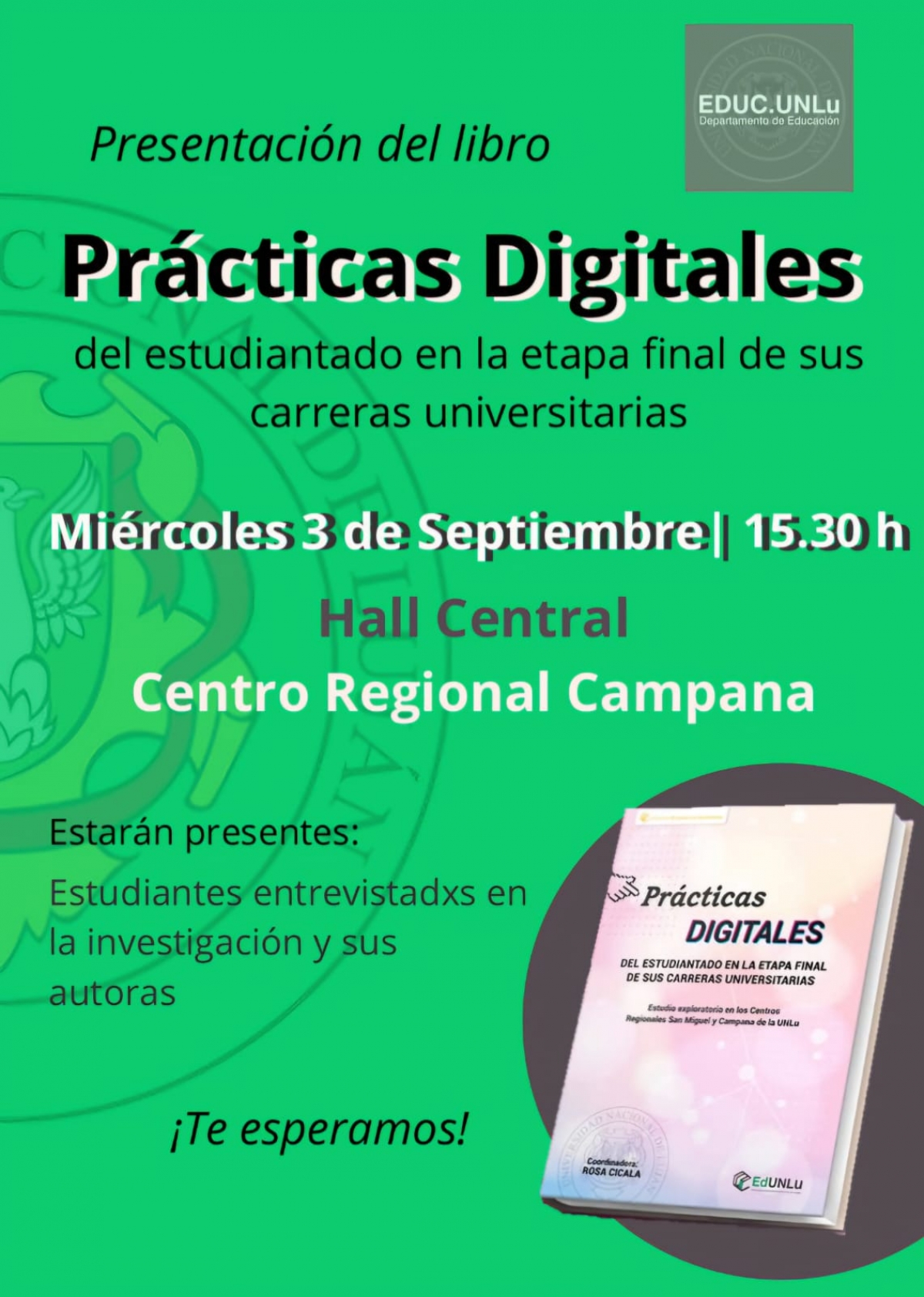 Este miércoles 3 de Septiembre, a las 15:30 horas en el Hall Central del Centro Regional Campana de la UNLu, se presentará el libro “Prácticas digitales del estudiantado en la etapa final de sus carreras universitarias. Estudio exploratorio en los Centros Regionales San Miguel y Campana de la UNLu”.
