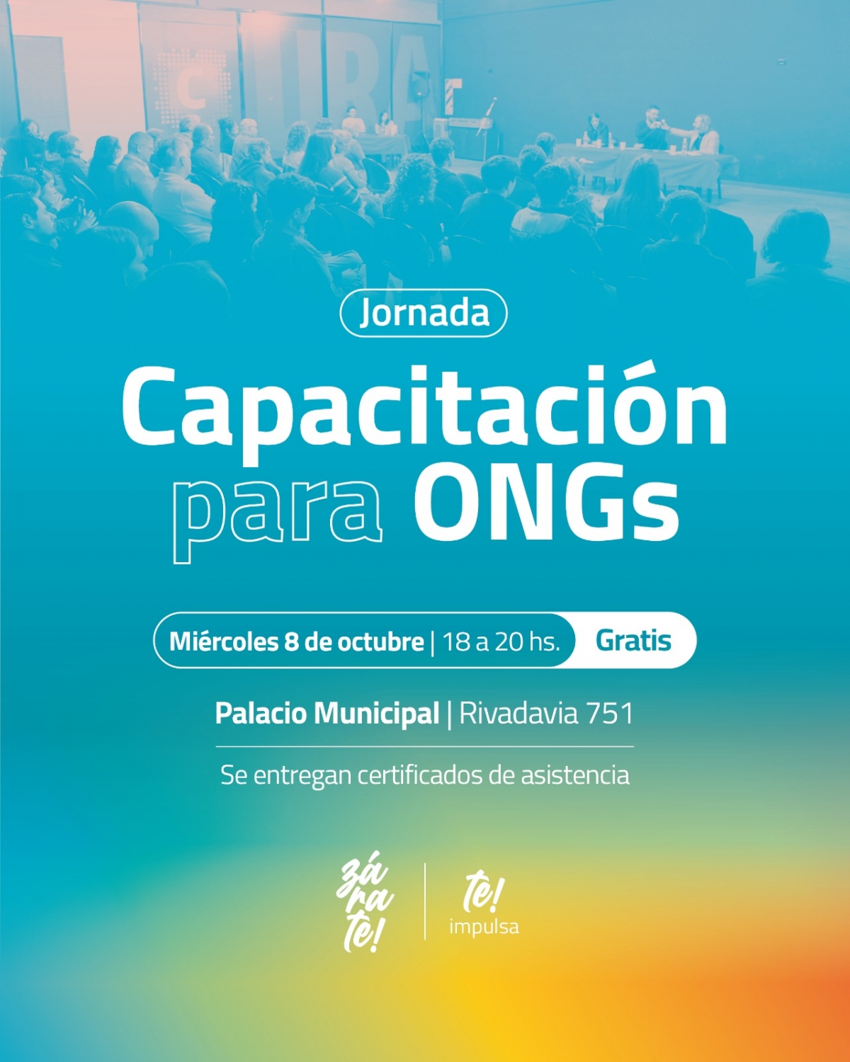 La Dirección de Relaciones con la Comunidad realizará una Jornada de Capacitación para ONGs, el día miércoles 8 de octubre de 18:00 a 20:00 hs. La misma se desarrollará en el salón de actos del Palacio Municipal (Rivadavia 751) -1° piso.