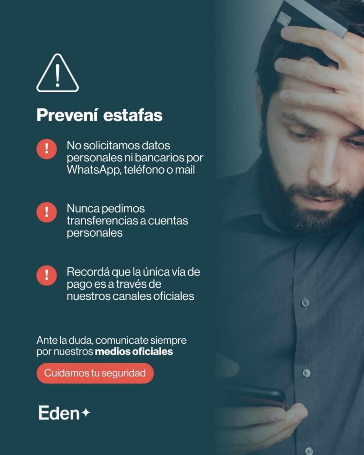 Con el fin de proteger a sus usuarios y brindar información clara sobre posibles intentos de estafa, EDEN lanzó una nueva campaña preventiva de concientización a través de distintos canales bajo el lema: Juntos nos cuidamos de las estafas.