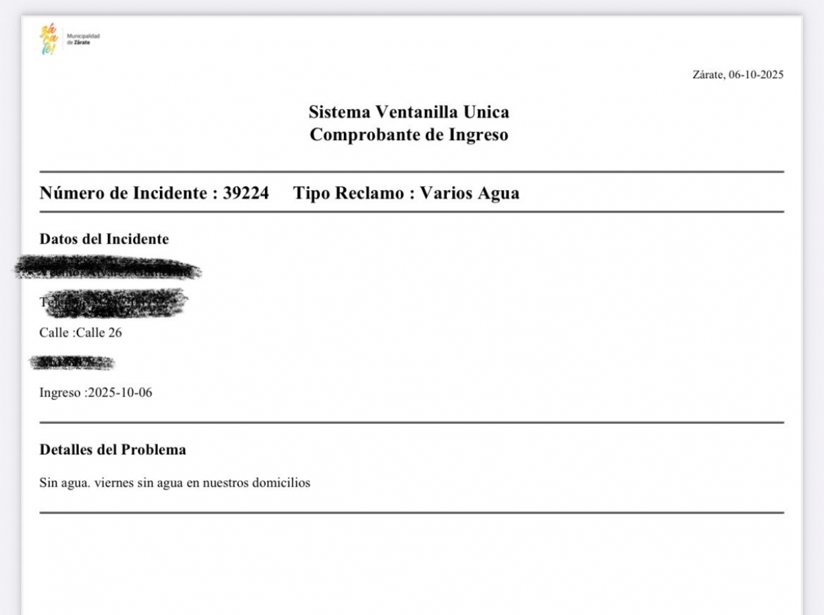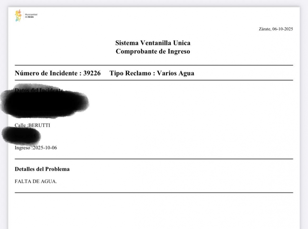"Quiero hacer un descargo. Soy vecina de Zárate, actualmente vivo en barrio Ilusión y hace 4 días que estamos sin agua. Ya se hizo el correspondiente descargo a Endeza, pero hasta ahora no han solucionado nada", expresó una vecina a este medio, y agregó: "En mi caso estoy en Berutti y calle 26, si bien hay dos o tres casas que tienen agua eso es más adelante del barrio, pero para atras nadie tiene".