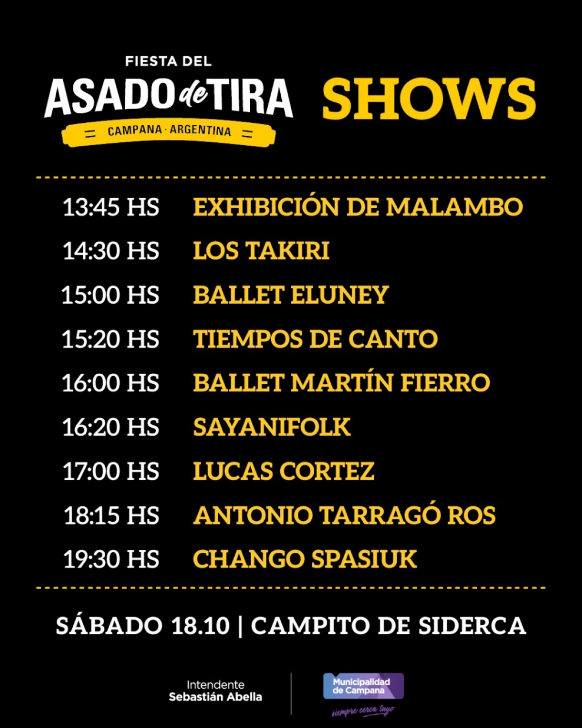 La Fiesta del Asado de Tira, que se realizará este sábado 18 desde las 11 en el Campito de Siderca, tendrá un condimento especial: una gran grilla de shows musicales con la presencia de artistas locales y músicos de renombre nacional.