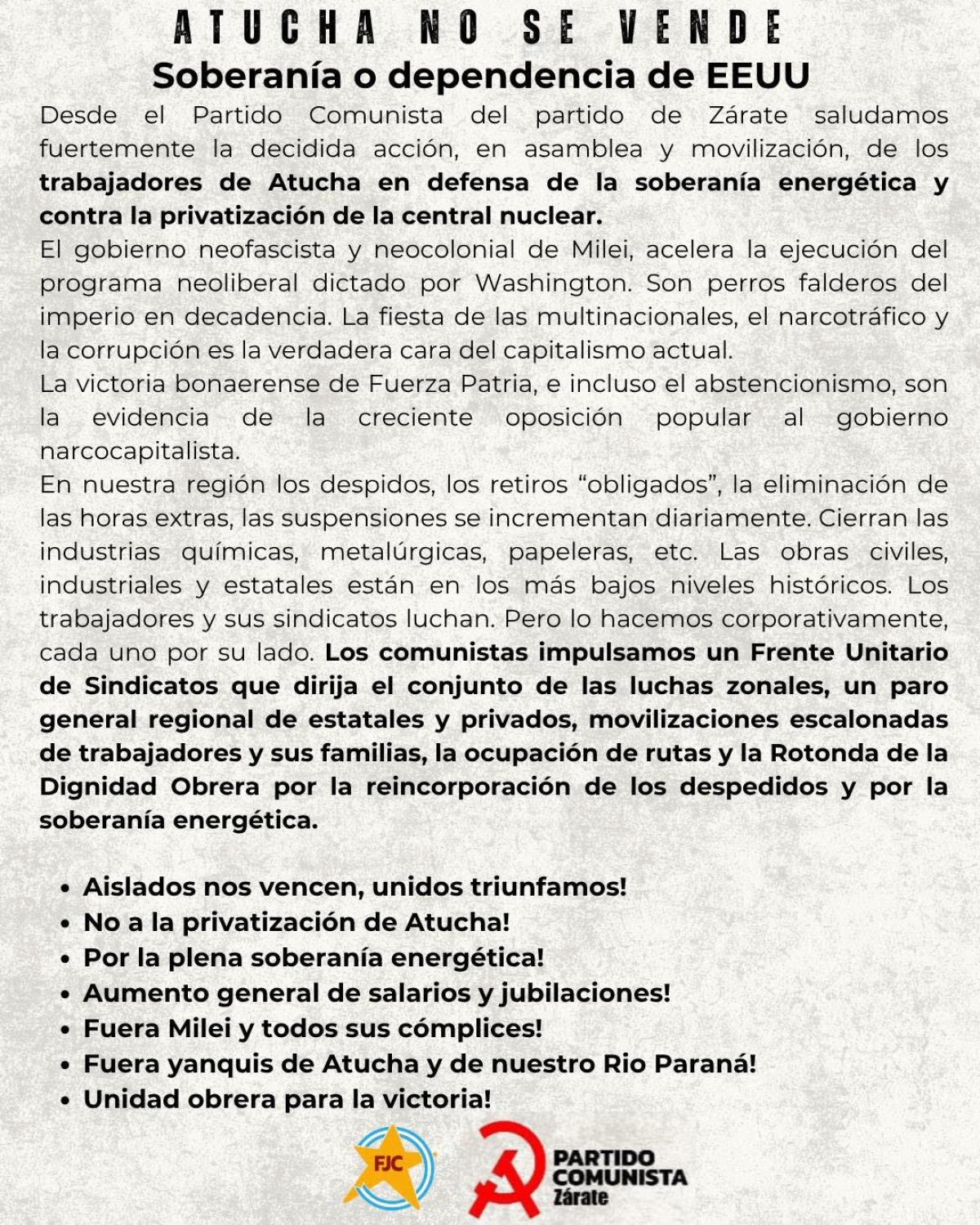 Desde el Partido Comunista del partido de Zárate saludamos fuertemente la decidida acción, en asamblea y movilización, de los trabajadores de Atucha en defensa de la soberanía energética y contra la privatización de la central nuclear.
