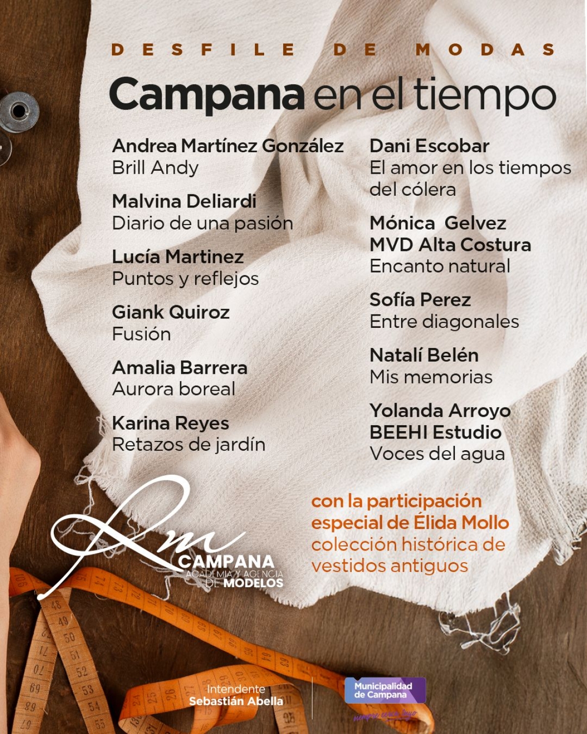 Bajo el título “Campana en el Tiempo”, diseñadoras vecinas participarán con sus colecciones inspiradas en distintos estilos y temáticas. Ellas son: Elida Mollo; Dani Escobar “El amor en los tiempos del cólera”; Malvina Deliardi “Diario de una pasión”; Lucía Martínez “Puntos y Reflejos”; Giank Quiroz “Fusión”; Amalia Barrera “Aurora Boreal”; Mónica Gelvez MVD Alta Costura “Encanto Natural”; Karina Reyes “Retazos de Jardín”; Andrea Martínez González “Brill Andy”; Sofía Pérez “Entre diagonales”; Natalí Belén “Mis memorias”, y Yolanda Arroyo BEEHI Estudio “Voces del agua”.