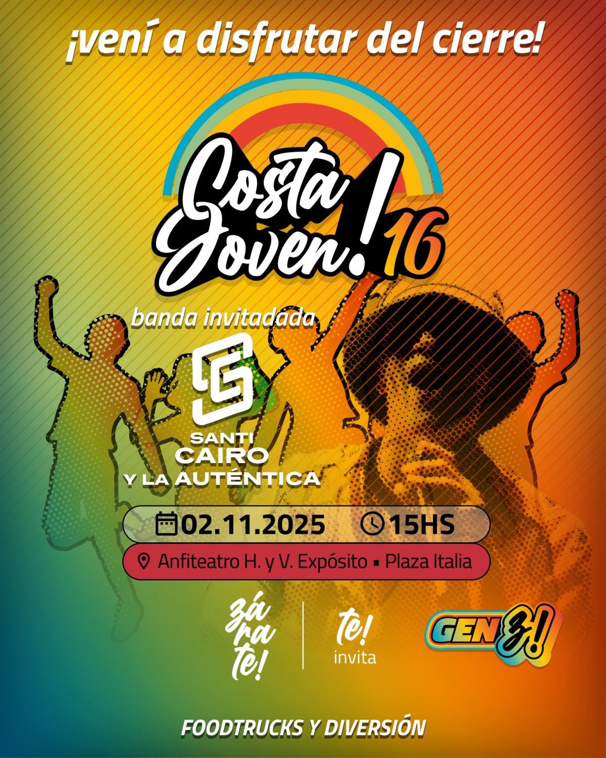 La Dirección de Juventud, dependiente de la Secretaría de Desarrollo Humano de la Municipalidad de Zárate, invita a la comunidad a disfrutar de la gran final de Costa Joven, edición 16, que se llevará a cabo este domingo 2 de noviembre desde las 15 hs. en el Anfiteatro H. y V. Expósito (Plaza Italia).